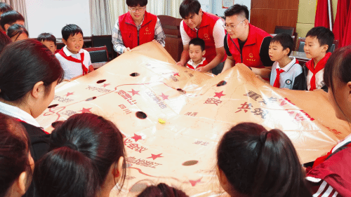 活動還設(shè)置了沉浸式互動環(huán)節(jié)。在重走長征路游戲中,孩子們分組協(xié)作,齊心運送“長征火種”,在一次次的嘗試中體會百折不撓的意志品質(zhì);在我們一起來閱兵環(huán)節(jié)中,孩子們在青年志愿者的協(xié)助下開啟“國防武器盲盒”,將組裝完成的模型整齊排列、模擬閱兵,深刻理解“落后就要挨打”的歷史教訓(xùn)與“強國必須強軍”的時代意義。簡單的游戲形式,承載的是對紅色基因的生動傳承。