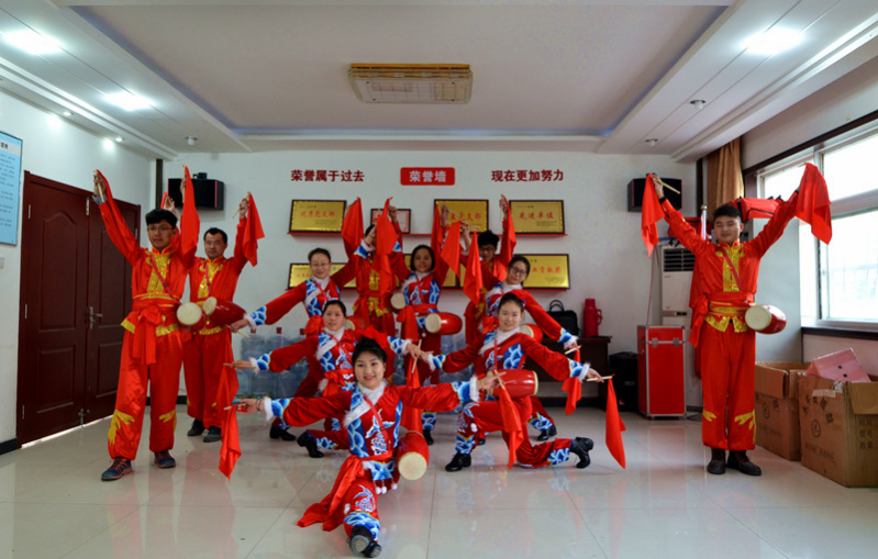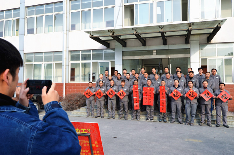 3.為參加總部春晚,員工胡國慶(右一)在網(wǎng)上購買了服裝、道具,并利用業(yè)余時(shí)間組織大家反復(fù)排練。原料磅房工作人員陳海萍(前一)自學(xué)舞蹈教程,主動(dòng)承擔(dān)領(lǐng)舞的角色。為鼓勵(lì)無為華塑,總部狗年春晚安排吉祥腰鼓《歡聚一堂》第一個(gè)上場。