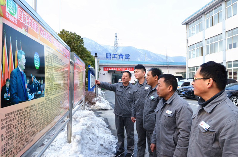 5.員工們?cè)谛麄鳈淮皟?nèi)學(xué)習(xí)公司總部2018年工作報(bào)告。雖然遠(yuǎn)離總部,該公司高度重視宣傳工作,開通了廣播站,增設(shè)了宣傳櫥窗,及時(shí)傳遞淮北礦業(yè)及華塑總部的政策、文件精神。
