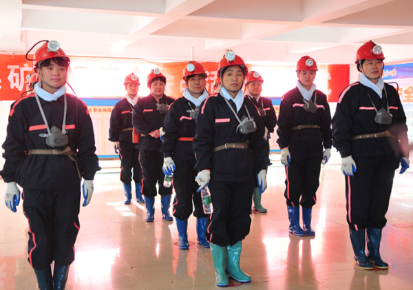 礦嫂們?cè)诰诤蚬奘伊嘘?duì)準(zhǔn)備入井。