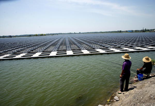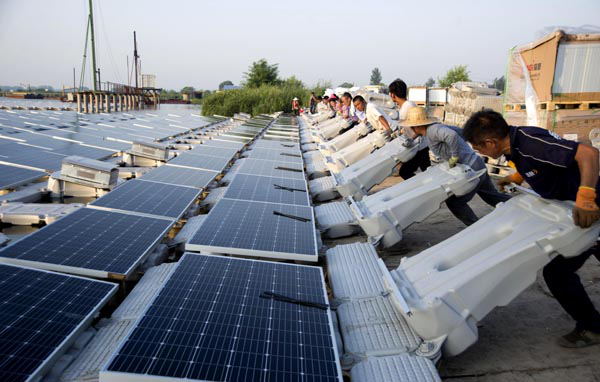 近日,施工單位人員在朱仙莊煤礦采煤塌陷區(qū)安裝光伏板。