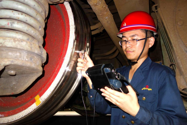 “輪對是機車的‘雙足’,足健方能日行千里”,鐵運處應(yīng)用新設(shè)備“CTS-9006數(shù)字超聲波探傷儀”對機車的輪對踏面和車軸進行探傷,及早發(fā)現(xiàn)輪對和車軸存在的裂紋和缺陷,排除安全隱患,確保機車運行安全。圖為:臨渙機輛段機車探傷員正在車底對輪對踏面進行探傷。