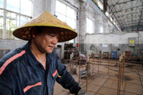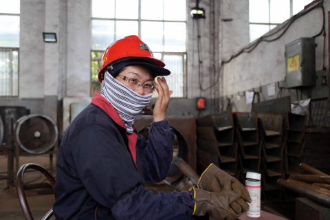 鉚焊班唯一女焊工趙靜,加工好一上午15塊套箍焊燜盤(pán),退去“武裝”,輕輕摸去臉上的汗珠。