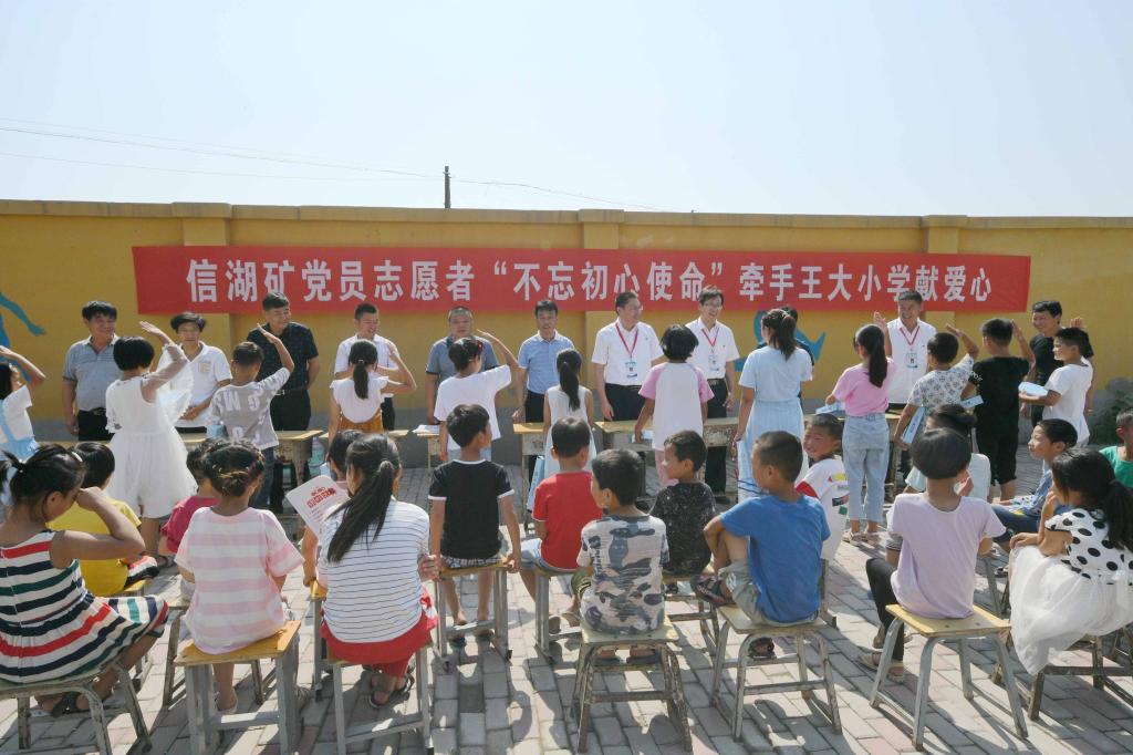 7月1日,在黨的第98個生日這一天,信湖礦組織黨員志愿者在渦陽縣花溝鎮(zhèn)王大小學(xué)進行關(guān)心慰問活動,為該校80余名兒童贈送了“文具大禮包”。