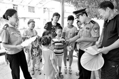 7月6日,淮北市公安局朔里派出所民警在向社區(qū)居民解讀治安防范宣傳材料。暑假來臨,淮北礦業(yè)集團(tuán)朔里礦業(yè)針對(duì)老礦區(qū)留守兒童多、空巢老人多的情況,聯(lián)合駐地派出所深入社區(qū)宣講消防安全、居家安全、出行安全、自我保護(hù)、應(yīng)急呼救等知識(shí),增強(qiáng)留守兒童、老人的自防自救能力和安全防范意識(shí)。 喬時(shí)慶 周勇 攝