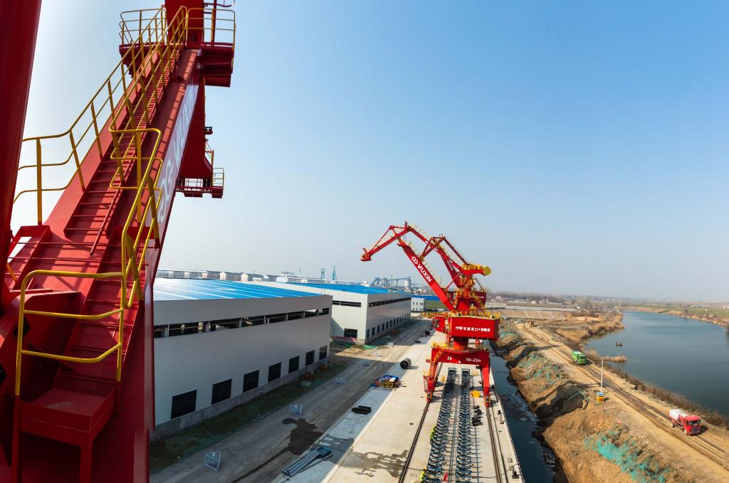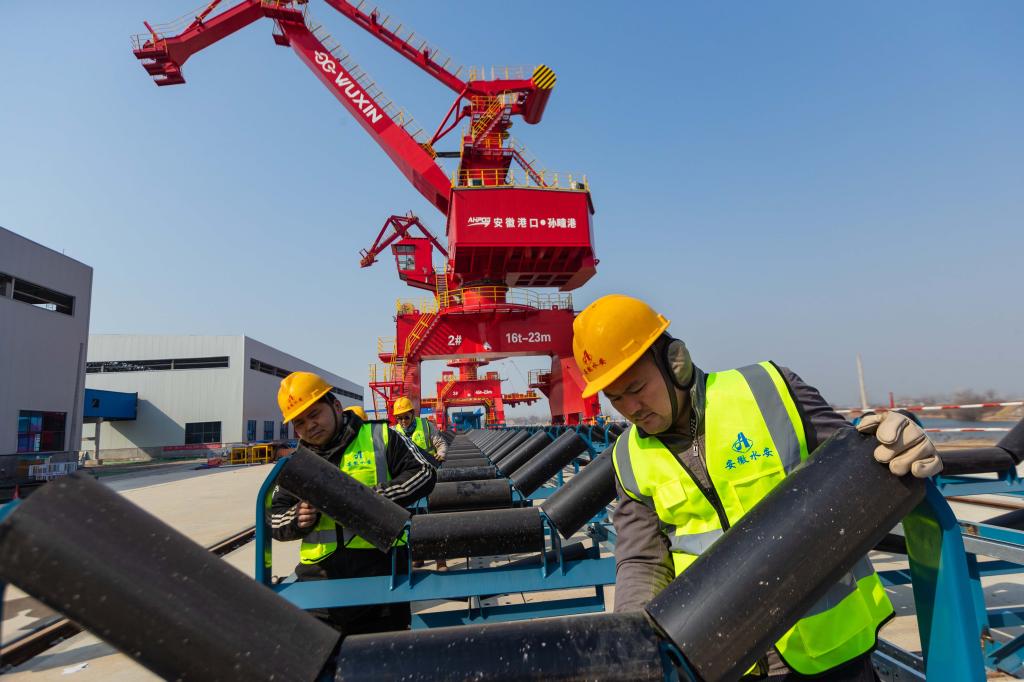 1月31日,淮北港孫疃碼頭工程建設(shè)現(xiàn)場(chǎng),起重機(jī)、多用途門機(jī)、移動(dòng)式裝船機(jī)等一臺(tái)臺(tái)大型港機(jī)設(shè)備傲然屹立在澮河岸邊,施工人員正在為設(shè)備的聯(lián)調(diào)聯(lián)試作準(zhǔn)備。