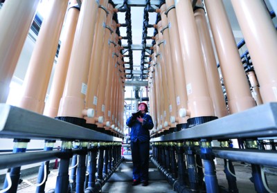 4月8日,工作人員查看淮北礦業(yè)臨渙焦化廢水深度處理項(xiàng)目超濾車(chē)間設(shè)備運(yùn)轉(zhuǎn)情況。淮北礦業(yè)臨渙焦化廢水深度處理一期項(xiàng)目日前建成投用,采用先進(jìn)技術(shù)處理焦化廢水,實(shí)現(xiàn)回收再利用,每天可生產(chǎn)1680立方米循環(huán)冷卻水和1920立方米鍋爐補(bǔ)給水,系統(tǒng)水回用率達(dá)75%。 本報(bào)記者 程兆 攝