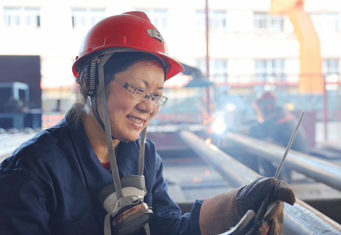 第二天下午,當(dāng)最后一道焊口收弧,她摘下面罩,由于長時間蹲坐姿勢,一下癱坐在地上。
