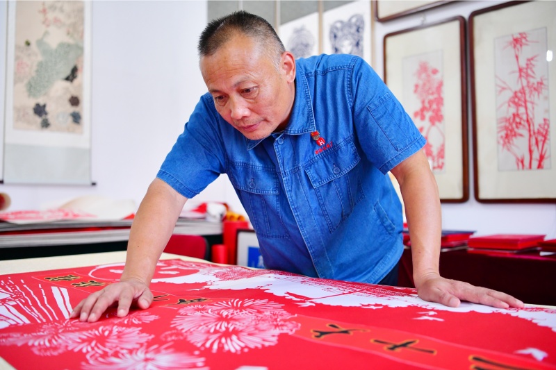 其中,紅色主題是他最擅長(zhǎng)也最喜愛(ài)的。他將黨的豐功偉績(jī)、祖國(guó)巨大變化巧妙融入剪紙中,以藝術(shù)之美傳承紅色文化,賡續(xù)紅色血脈。代表作有《毛主席去安源》《遵義會(huì)議放光芒》、偉人像和毛澤東詩(shī)詞等20多幅。他的作品先后走進(jìn)北京人民大會(huì)堂、中國(guó)美術(shù)館,登上《人民日?qǐng)?bào)》(海外版)等報(bào)刊,還被中國(guó)剪紙藝術(shù)館收藏,更贈(zèng)銷(xiāo)至美、澳、德等國(guó)家和地區(qū),讓世界看見(jiàn)中國(guó)剪紙的魅力。
