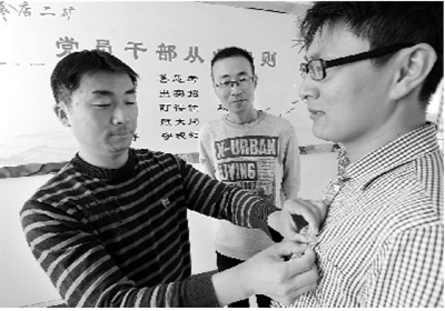 安徽淮北礦業(yè)集團依托“三會一課”等黨的組織生活制度,將“兩學一做”學習教育與安全生產各項工作有機結合,并開展了“亮身份、作承諾、當先鋒、樹形象”等活動。圖為袁店二礦黨員在相互佩戴黨員徽章。 黃世鵬 攝