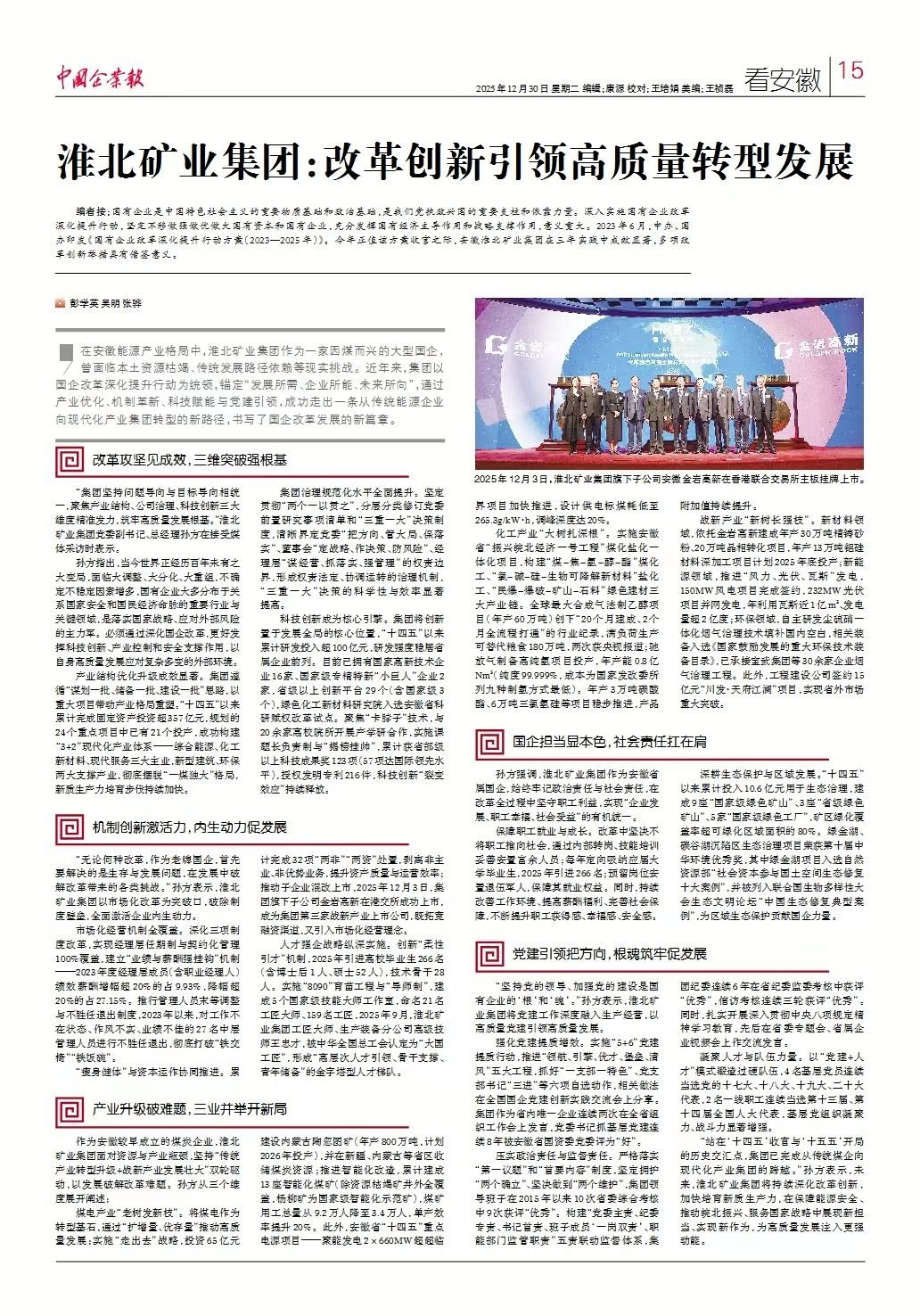 “站在‘十四五’收官與‘十五五’開(kāi)局的歷史交匯點(diǎn),集團(tuán)已完成從傳統(tǒng)煤企向現(xiàn)代化產(chǎn)業(yè)集團(tuán)的跨越?!睂O方表示,未來(lái),淮北礦業(yè)集團(tuán)將持續(xù)深化改革創(chuàng)新,加快培育新質(zhì)生產(chǎn)力,在保障能源安全、推動(dòng)皖北振興、服務(wù)國(guó)家戰(zhàn)略中展現(xiàn)新?lián)?dāng)、實(shí)現(xiàn)新作為,為高質(zhì)量發(fā)展注入更強(qiáng)動(dòng)能。