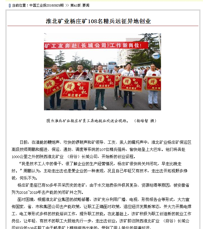 “楊莊礦很快將關井,走出去是必然的事,現(xiàn)在礦上想到的不是減人,而是想辦法為我們聯(lián)系工作,為我們搭建外出創(chuàng)業(yè)的舞臺,礦主要領導還親自把我們送到就業(yè)的地方,我現(xiàn)在很高興,也很感謝礦領導?!痹摰V赴陜西淮北礦業(yè)(府谷)長城公司創(chuàng)業(yè)的領頭人之一、原礦掘進區(qū)隊黨支部書記趙磊開心地說道。