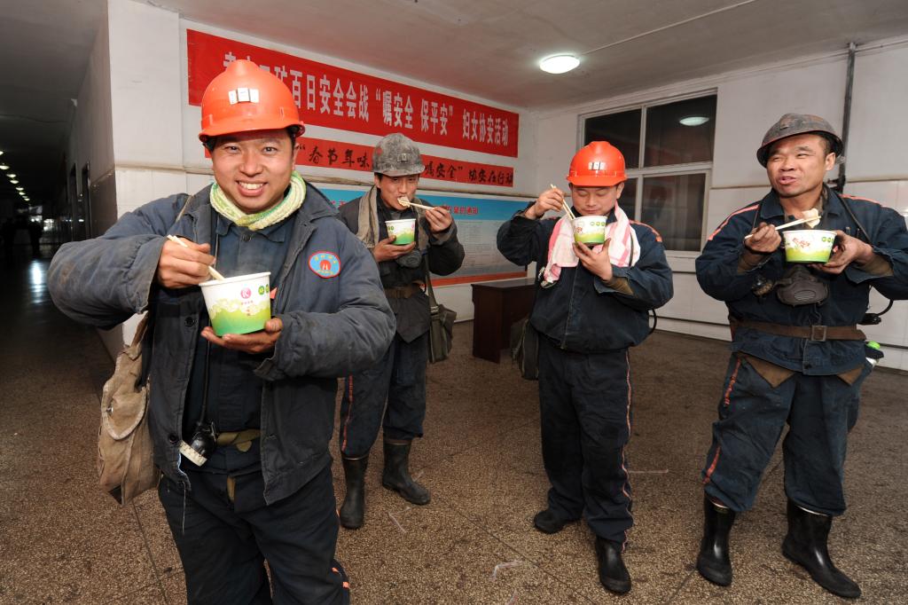 除夕夜,安徽淮北礦業(yè)集團(tuán)袁店二礦升井后的礦工吃上了女工協(xié)安員準(zhǔn)備的熱氣騰騰的餃子。 黃世鵬 攝