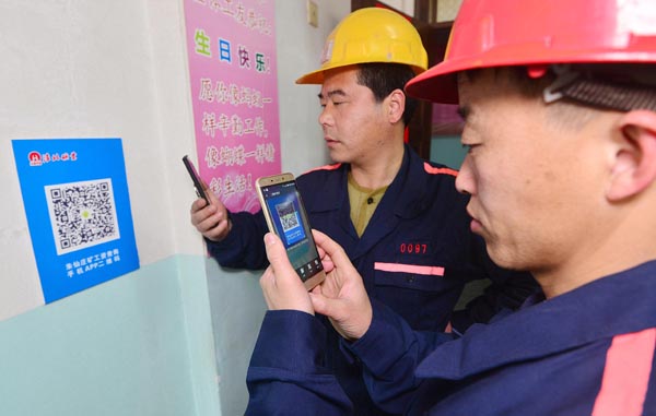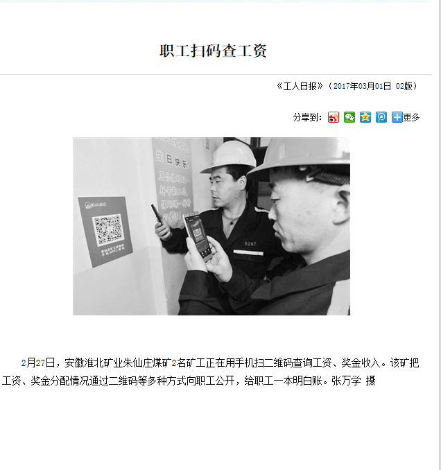 2017年2月27日,安徽淮北礦業(yè)朱仙莊煤礦綜掘二區(qū)2名礦工正在單位會議室用手機掃二維碼查詢工資、獎金收入。該礦把職工工資、獎金分配情況通過公開欄、工資查詢系統(tǒng)、二維碼等多種方式向職工公開,給職工一本明白賬。(張萬學(xué)攝)
