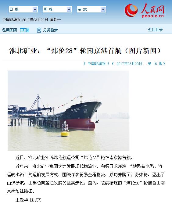 近年來,淮北礦業(yè)集團大力發(fā)展現(xiàn)代物流業(yè),積極尋求煤炭“鐵路轉水路、汽運轉水路”的運輸發(fā)展方式,圍繞煤炭貿易全程物流,成功并購了江蘇煒倫,邁出了由煤涉航,由黑色向藍色發(fā)展的堅實步伐。圖為,裝滿精煤的“煒倫28”輪準備由南京港駛往浙江。