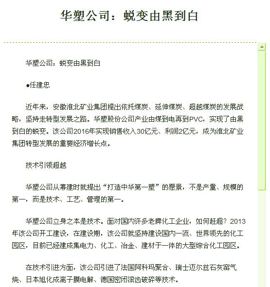 近年來,安徽淮北礦業(yè)集團提出依托煤炭、延伸煤炭、超越煤炭的發(fā)展戰(zhàn)略,堅持走轉(zhuǎn)型發(fā)展之路。華塑股份公司產(chǎn)業(yè)由煤到電再到PVC,實現(xiàn)了由黑到白的蛻變。該公司2016年實現(xiàn)銷售收入30億元、利潤2億元,成為淮北礦業(yè)集團轉(zhuǎn)型發(fā)展的重要經(jīng)濟增長點。