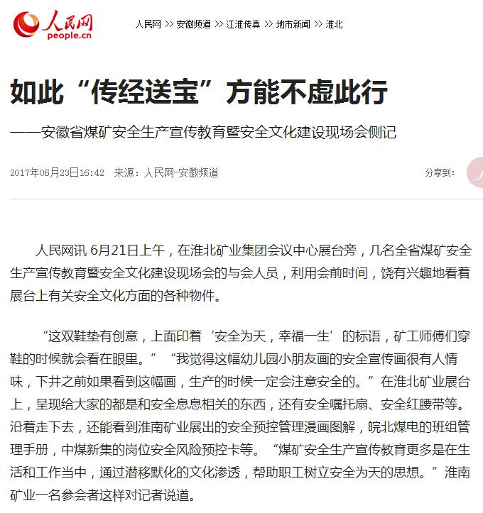 人民網(wǎng)訊6月21日上午,在淮北礦業(yè)集團(tuán)會(huì)議中心展臺(tái)旁,幾名全省煤礦安全生產(chǎn)宣傳教育暨安全文化建設(shè)現(xiàn)場(chǎng)會(huì)的與會(huì)人員,利用會(huì)前時(shí)間,饒有興趣地看著展臺(tái)上有關(guān)安全文化方面的各種物件。