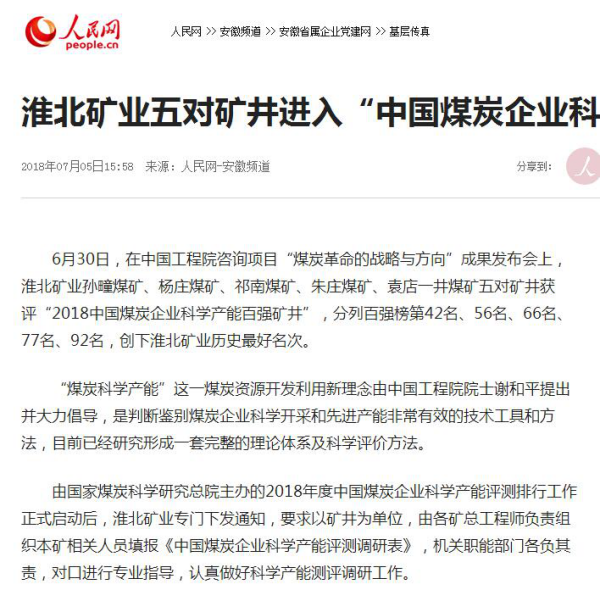 6月30日,在中國工程院咨詢項(xiàng)目“煤炭革命的戰(zhàn)略與方向”成果發(fā)布會上,淮北礦業(yè)孫疃煤礦、楊莊煤礦、祁南煤礦、朱莊煤礦、袁店一井煤礦五對礦井獲評“2018中國煤炭企業(yè)科學(xué)產(chǎn)能百強(qiáng)礦井”,分列百強(qiáng)榜第42名、56名、66名、77名、92名,創(chuàng)下淮北礦業(yè)歷史最好名次。