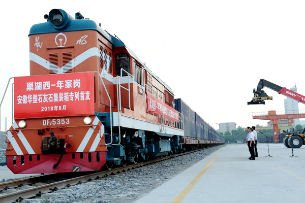 8月2日上午,首趟安徽華塑石灰石集裝箱專列駛?cè)牖幢钡V業(yè)滁州華塑物流園區(qū)