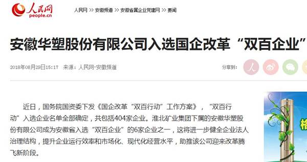 安徽華塑股份有限公司入選國企改革“雙百企業(yè)”
