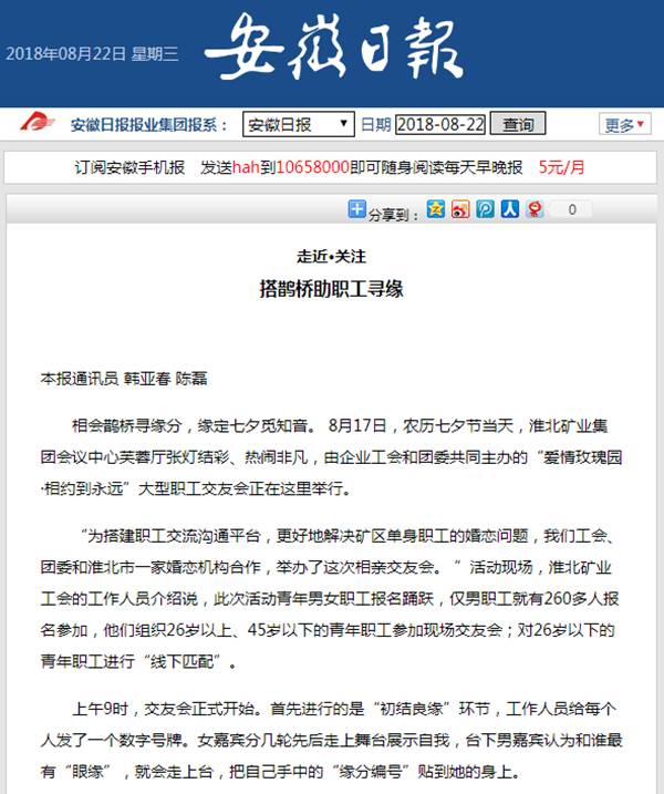 多年來,淮北礦業(yè)集團(tuán)一直堅(jiān)持“事業(yè)留人、環(huán)境留人、感情留人”的人才引進(jìn)培養(yǎng)原則,多方關(guān)愛青年職工。企業(yè)工會早在2013年就組建了“礦區(qū)紅娘”QQ群,注冊礦區(qū)兼職“紅娘”89人,定期發(fā)布單身男女相親信息。5年來,企業(yè)工會先后發(fā)布單身青年信息600余條,于2010年、2011年和2017年成功舉辦了3屆大型單身職工交友會,為500多人次的單身青年職工牽線搭橋,促成數(shù)十對青年職工走進(jìn)婚姻殿堂。