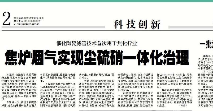 《中國(guó)化工報(bào)》2版頭條:淮北礦業(yè)焦?fàn)t煙氣實(shí)現(xiàn)塵硫硝一體化治理