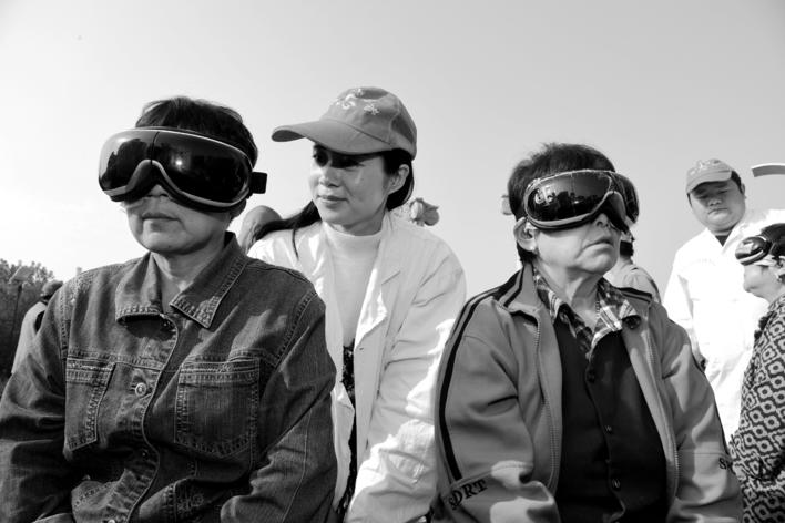 他們?yōu)榫用裉峁┝顺R娂膊〉念A(yù)防及治療、日常保健等方面的咨詢服務(wù),一上午的時(shí)間,共為社區(qū)居民提供了上百人次的服務(wù),受到了社區(qū)居民的一致好評(píng)。圖為一名志愿者正用儀器為兩名社區(qū)居民進(jìn)行眼部按摩。(張宗風(fēng))