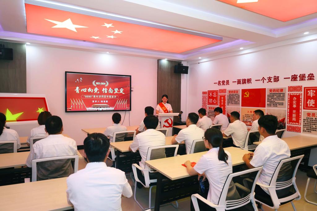 “在中國共產(chǎn)黨的領(lǐng)導(dǎo)下,中國發(fā)生了翻天覆地的變化,從一盤散沙到鋼鐵一塊,這是組織的力量,更是靈魂深處的信仰?!?月1日當(dāng)天,該礦“8090”宣講團成員趙佳莉結(jié)合中國共產(chǎn)黨一百余年來的成長歷程向與會青年認真講述。