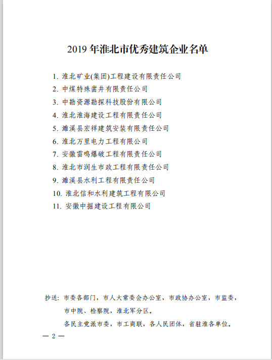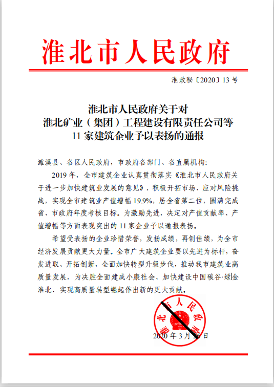 近日,淮北市人民政府下發(fā)了《關(guān)于對淮北礦業(yè)(集團)工程建設(shè)有限責任公司等11家建筑企業(yè)予以表揚的通報》,淮北礦業(yè)(集團)工程建設(shè)公司位居表揚榜首位。