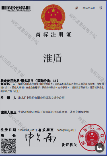 近日,綜采安拆分公司申請(qǐng)的“淮盾”牌注冊(cè)商標(biāo)獲得國(guó)家知識(shí)產(chǎn)權(quán)局批準(zhǔn),標(biāo)志著該公司品牌建設(shè)邁出實(shí)質(zhì)性一步。