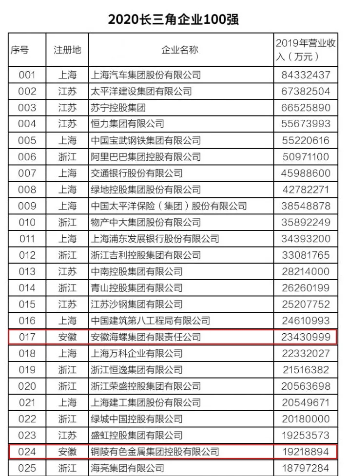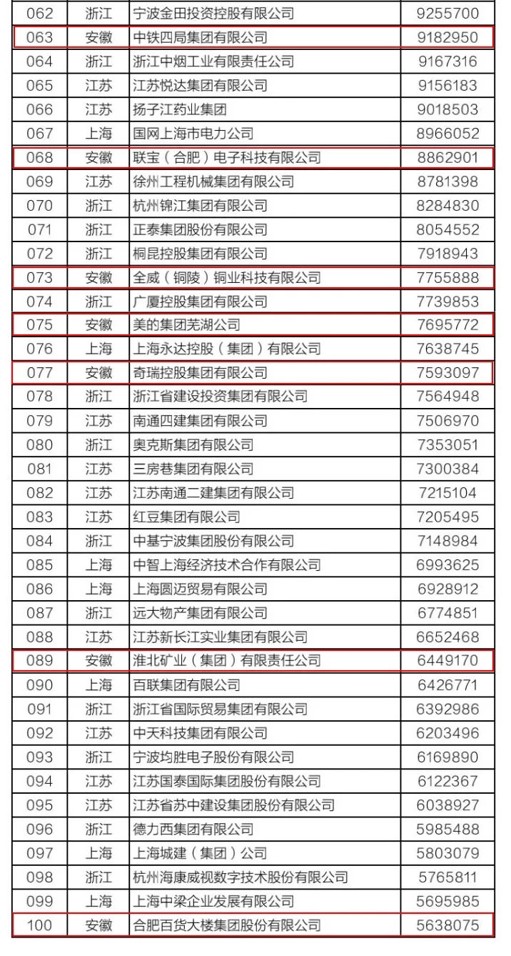 該榜單以2019年企業(yè)營業(yè)收入為入圍標(biāo)準(zhǔn),由長三角三省一市企業(yè)聯(lián)合會共同發(fā)布。今年是第二次發(fā)布長三角企業(yè)百強(qiáng)排行榜,入圍門檻是563.8億元,比上年提高了54.5億元。今年我省共有9家企業(yè)上榜,除淮北礦業(yè)集團(tuán)外,其他8家企業(yè)為海螺集團(tuán)、銅陵有色、中鐵四局、聯(lián)寶(合肥)電子、全威(銅陵)銅業(yè)、美的集團(tuán)蕪湖公司、奇瑞控股集團(tuán)和合肥百大,主要分布在水泥建材、有色金屬、汽車制造、煤炭和煤化工等行業(yè)。