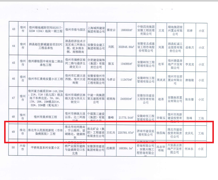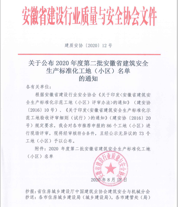 近日,安徽省建設(shè)行業(yè)質(zhì)量與安全協(xié)會(huì)公布了2020年度第二批安徽省建筑安全生產(chǎn)標(biāo)準(zhǔn)化工地(小區(qū))名單(建質(zhì)安協(xié)〔2020〕12號(hào))。工程建設(shè)公司承建的淮北市人民醫(yī)院新院(市傳染病醫(yī)院)項(xiàng)目榜上有名,榮獲“安徽省建筑安全生產(chǎn)標(biāo)準(zhǔn)化示范工地”稱號(hào)。