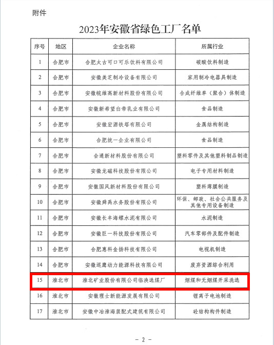 日前,安徽省經(jīng)濟(jì)和信息化廳公布2023年安徽省綠色工廠(chǎng)名單,淮北礦業(yè)臨渙選煤廠(chǎng)榜上有名,這是該廠(chǎng)繼去年獲評(píng)淮北市綠色工廠(chǎng)后的又一殊榮。