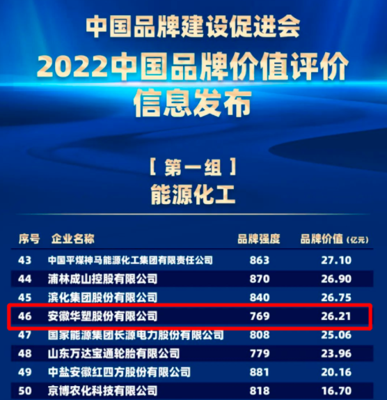 2022年9月5日,中國品牌建設(shè)促進(jìn)會、中國資產(chǎn)評估協(xié)會、新華社民族品牌工程辦公室等單位在京聯(lián)合發(fā)布“2022中國品牌價(jià)值評價(jià)信息”。今年參加評價(jià)的品牌數(shù)量達(dá)到1056個(gè),涵蓋大部分行業(yè)的龍頭企業(yè)。在2022年品牌價(jià)值評價(jià)中,華塑股份品牌位列第一組“能源化工”第46位,品牌強(qiáng)度為769,品牌價(jià)值26.21億元,是華塑股份品牌建設(shè)工作的重要成果。
