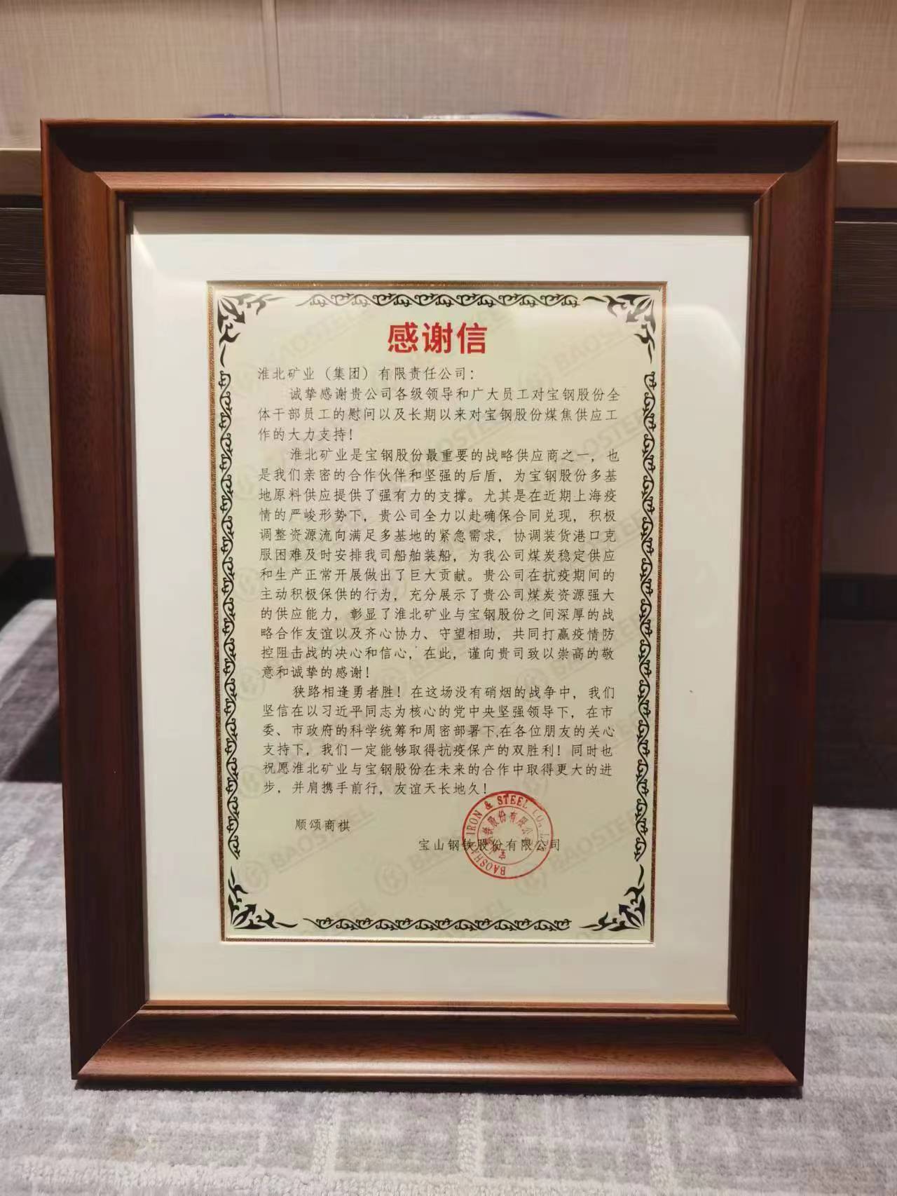 “貴公司在抗疫期間的主動(dòng)積極保供的行為,充分展示了貴公司煤炭資源強(qiáng)大的供應(yīng)能力,彰顯了淮北礦業(yè)與寶鋼股份之間深厚的戰(zhàn)略合作友誼以及齊心協(xié)力、守望相助,共同打贏疫情防控阻擊戰(zhàn)的決心和信心,在此,謹(jǐn)向貴司致以崇高的敬意和誠(chéng)摯的感謝!”