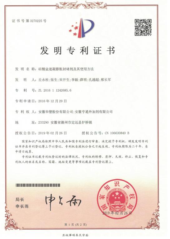 近日,由華塑股份組織研發(fā)的《硅酸鹽速凝膨脹封堵劑及其使用方法》技術,榮獲國家知識產(chǎn)權局授予的“發(fā)明專利證書”。此發(fā)明專利是華塑股份聯(lián)合安徽亨通外加劑有限公司共同研究,在淮北礦業(yè)集團及相關單位的大力配合和支持下完成的。
