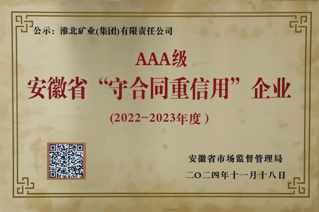 淮北礦業(yè)集團(tuán)榮獲安徽省市場(chǎng)監(jiān)管局頒發(fā)的3A級(jí)守合同重信用企業(yè)稱(chēng)號(hào)